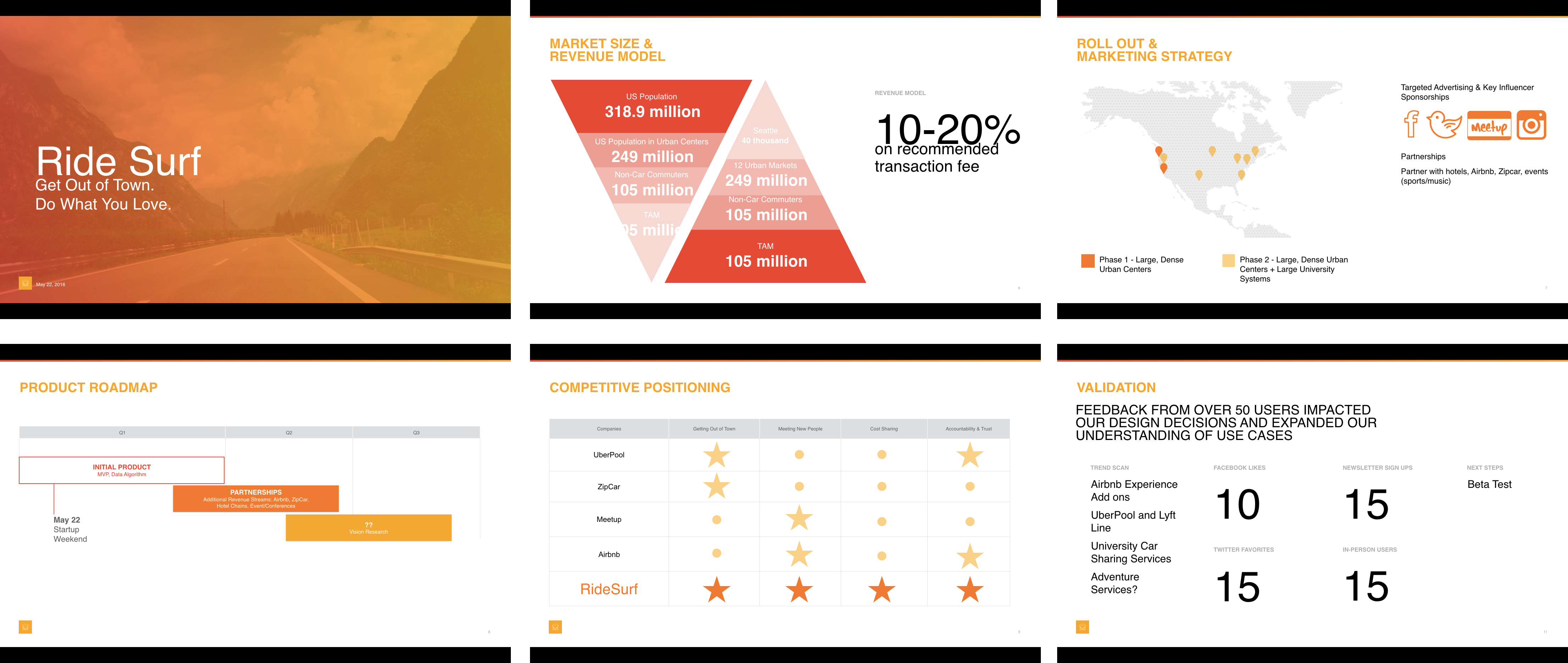 RideSurf was developed using Python, JavaScript, jQuery, PostgeSQL, Materialize, Flask, destination and activity matching, routing algorithms and a ranking/recommendation system.